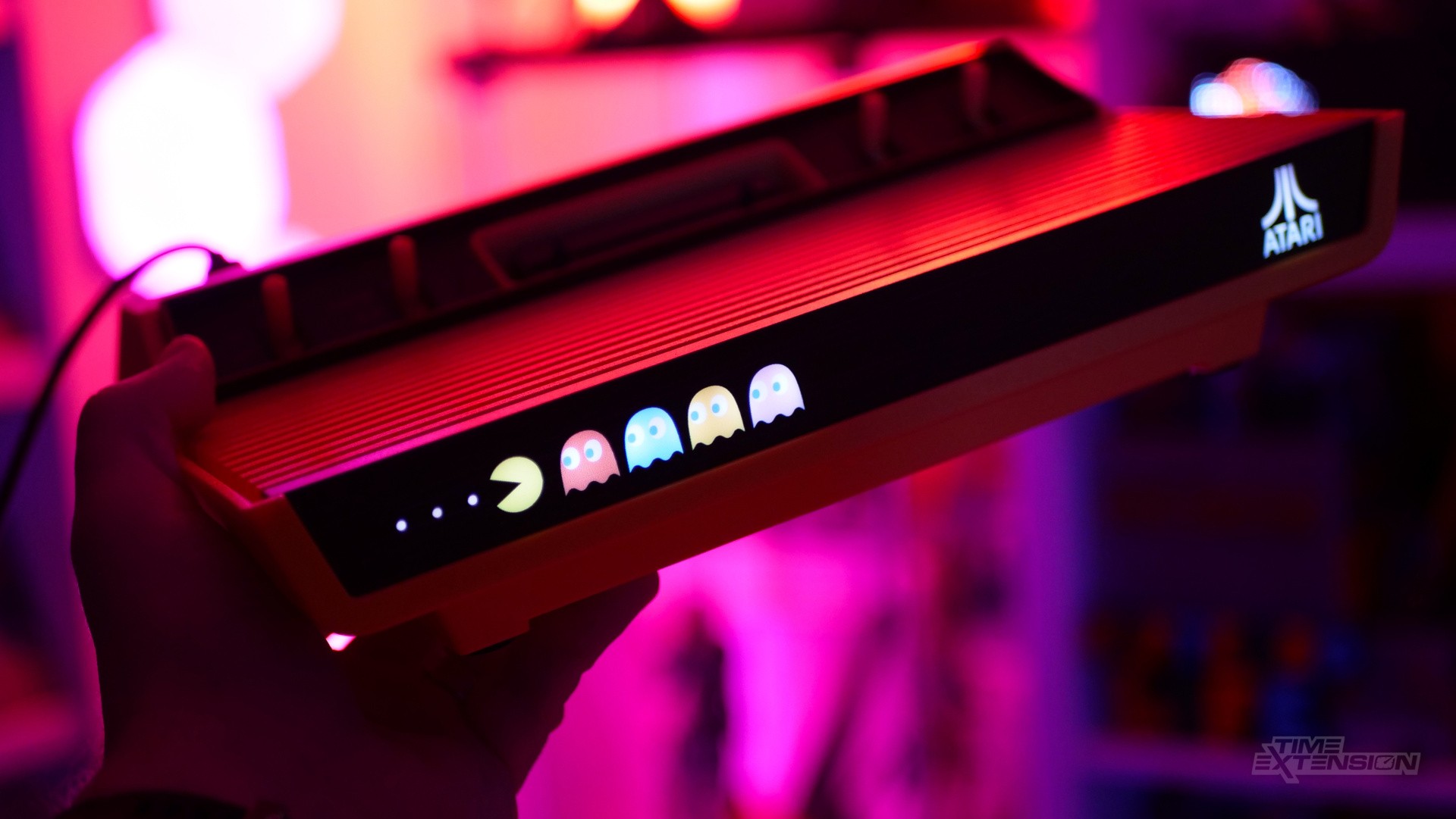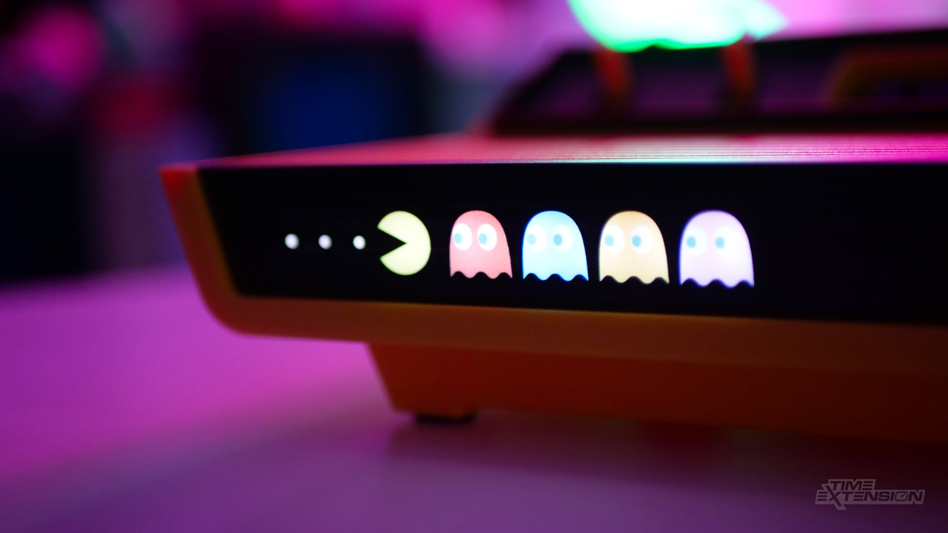 For example, the front panel on the console (which famously featured a woodgrain effect on the original) now showcases Pac-Man chasing the four members of the 'Ghost Gang': Blinky, Pinky, Inky, and Clyde. When you power up the machine, these are illuminated – as is the Atari logo, located on the right of the front panel.