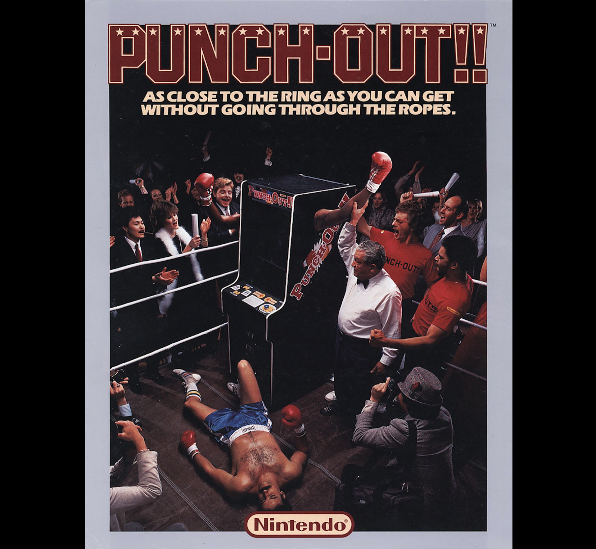 In the creation of the advertising sellsheet, Momoda submitted a sketch of a tall Punch-Out cabinet (w/arms), standing hand raised by a referee, positioned over a knocked out fighter on the mat. Nintendo’s advertising manager liked it, and a local boxing club was chosen as the location for a photoshoot. Apart from the fallen boxer and referee, everyone in the shoot was a Nintendo employee or one of Momoda’s friends.