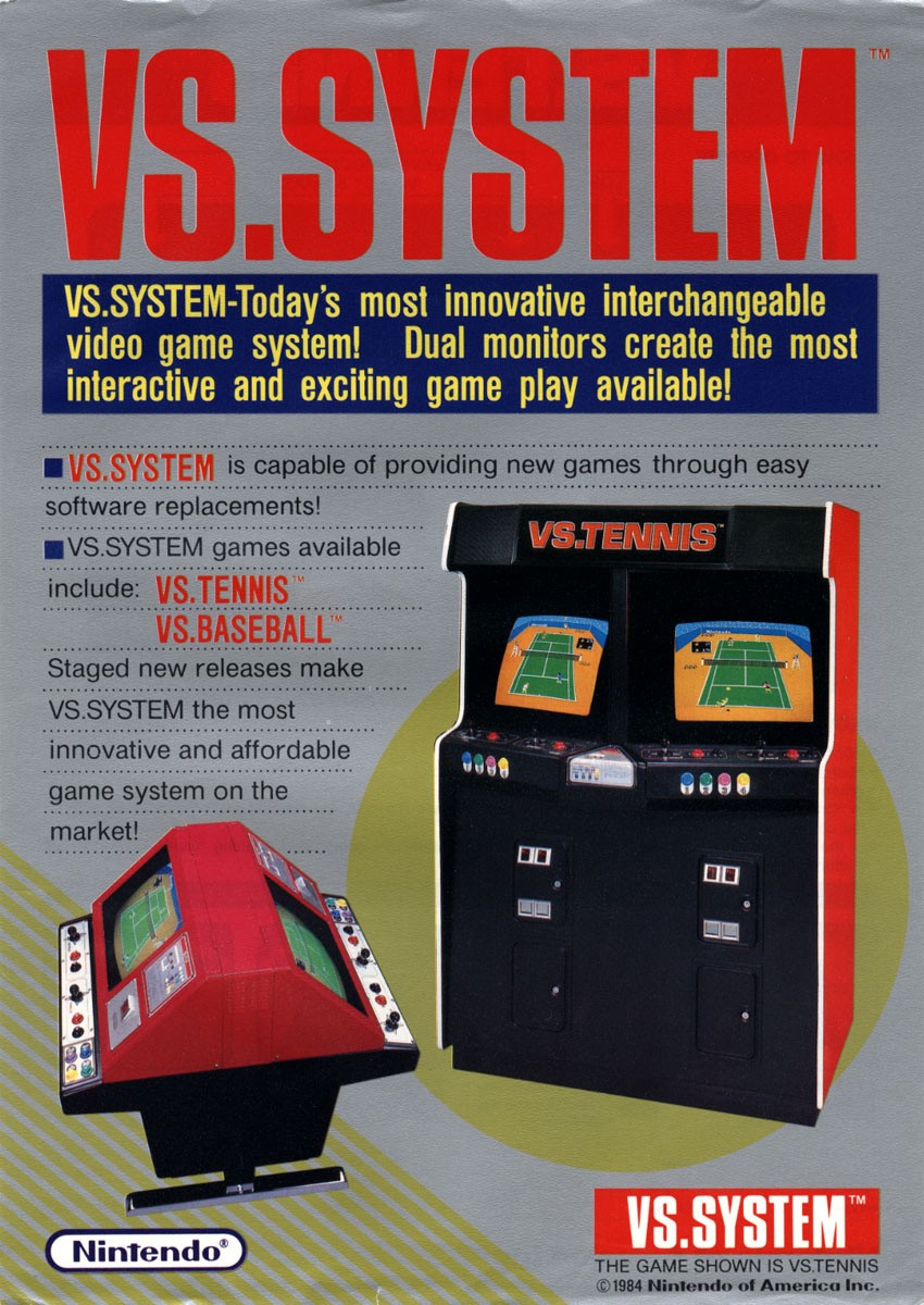 The Nintendo VS. System (or VS. System for short) had, just like Punch Out!!, been unveiled at the ASI event in February 1984. It was designed to cater to the arcade industry's demand for lower-priced games. It was available in three configurations — an upright two-screen (side by side) DualSystem cabinet, and a sit-down, tent-styled, two-screen (across) DualSystem setup — prioritizing a multiplayer ”versus” style experience, with the DualSystem variants also being fitted with a pair of dual-screen monitors to allow opposing players their own individual screen to play on. Later on, a single-screen upright version named the UniSystem was also released.