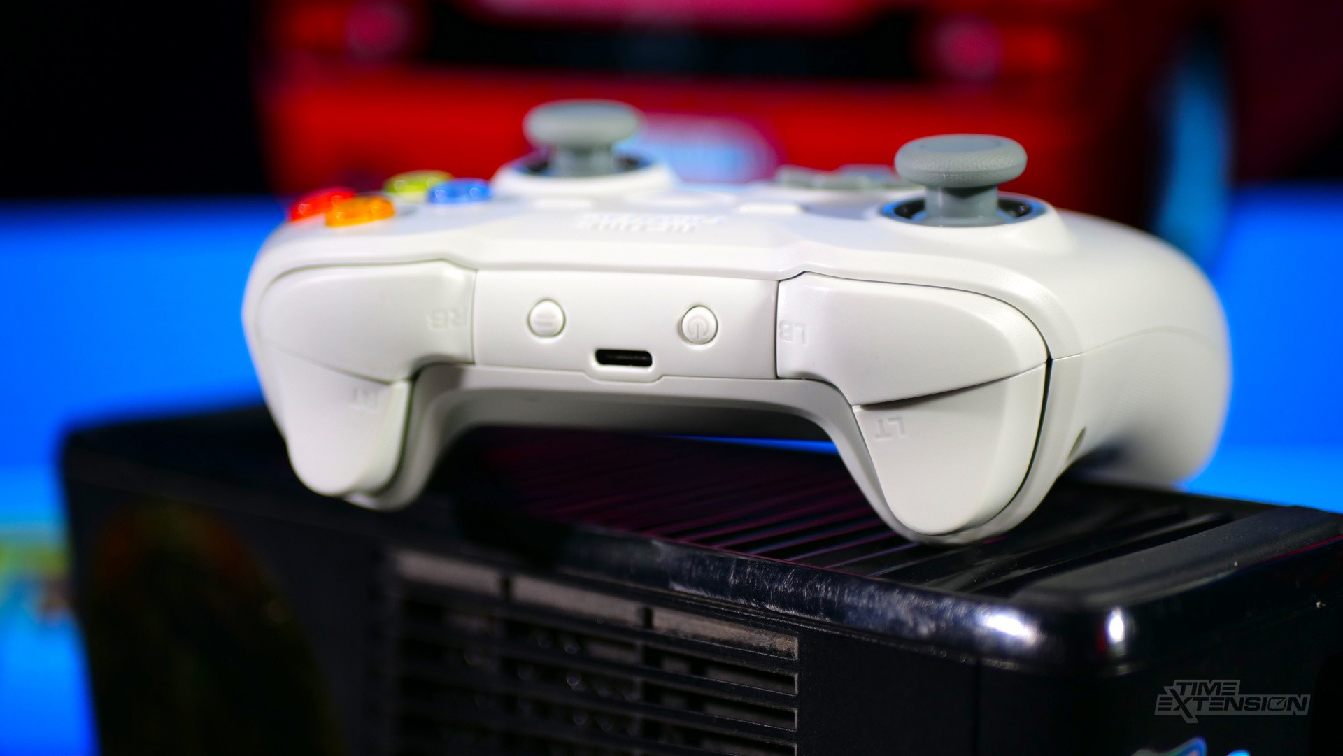 The controller is charged via the USB-C port on the top, and Retro Fighters has included a braided charging cable in the box. You can expect approximately 10 hours of use on a single charge. There's also the 2.4 GHz USB-A dongle, which is required when playing on the 360 because the console doesn't have this low-latency wireless technology built in.