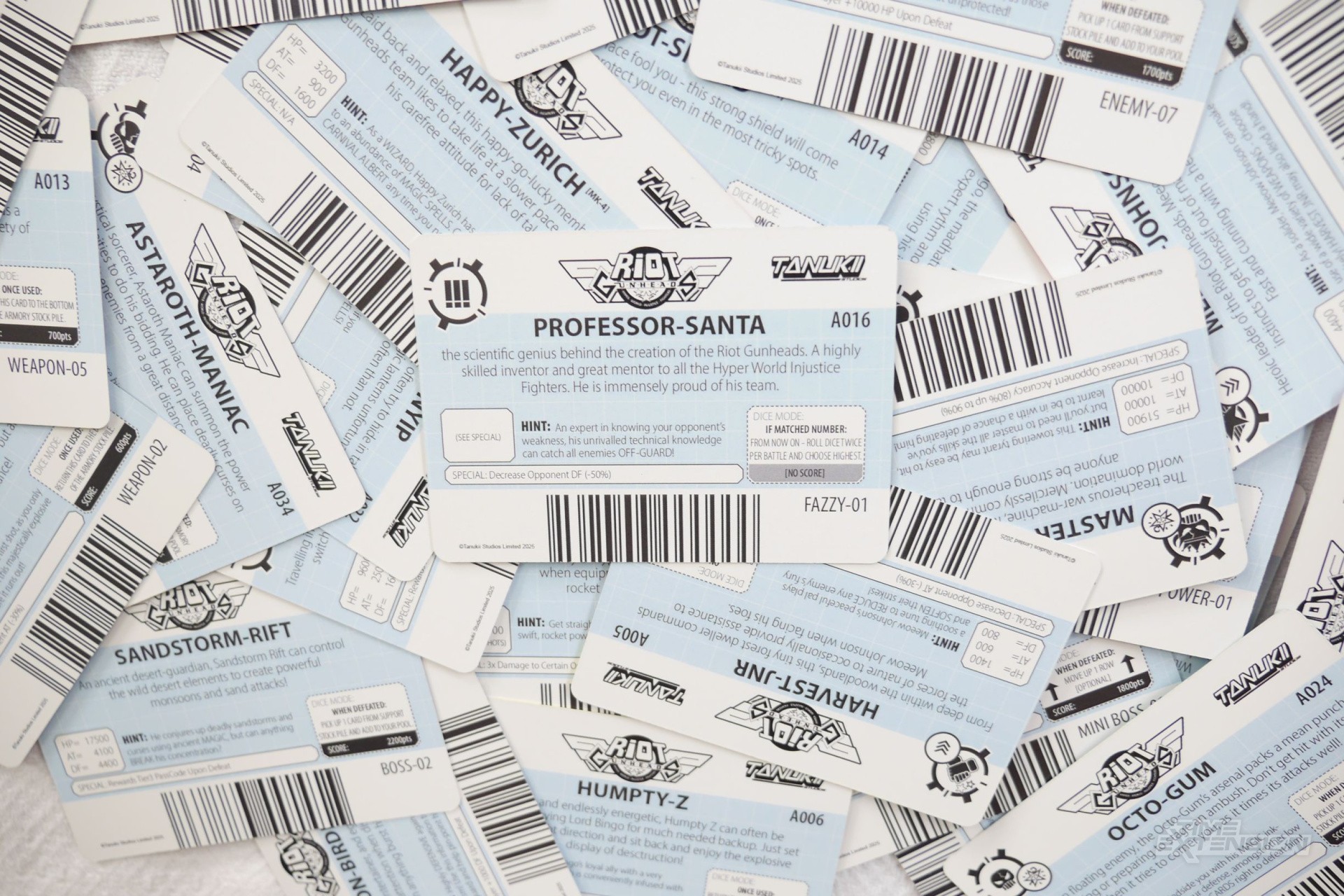 Tony helped out tremendously with a lot of the stats and barcode encodings; we had quite a few tables and charts drawn up to figure out how this would all work. It was then a case of presenting that data in a humorous and accessible way, which is why the hints are on the cards themselves, either overtly or cryptically. This adds some much-needed "quality of life" improvements.