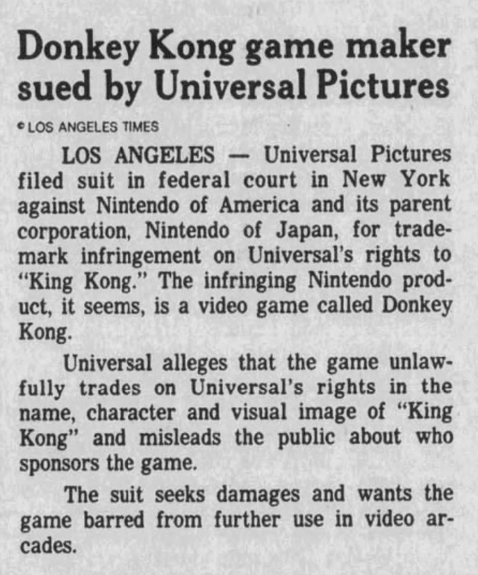 Universal City Studios, Inc. v. Nintendo Co., Ltd. was triggered by the release of the massively popular arcade title Donkey Kong in 1981, which Universal claimed infringed on King Kong.